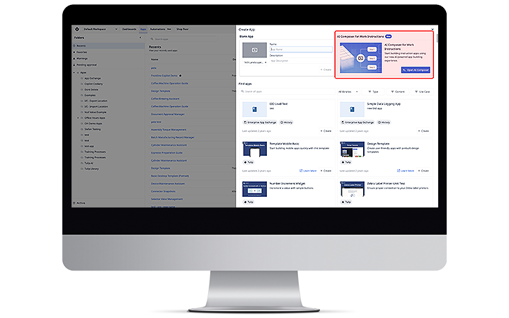 • App creation: Create apps, logic, and dashboards with simple prompts and AI Composer: PDF and video-based work instructions and process representations are converted into dynamic, interactive apps
